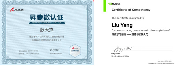 此外,本次课程践行beat365体育官网平台“双证融通”的应用型人才培养的重要举措,通过课程融合和课后自学相结合的方式,鼓励学生通过行业职业技能认证,并将其纳入课程的考核。本次课程中,共计33人次完成华为昇腾微认证证书,75人(占比95%)完成英伟达深度学习基础认证,获得人工智能领域相关职业技能证书。