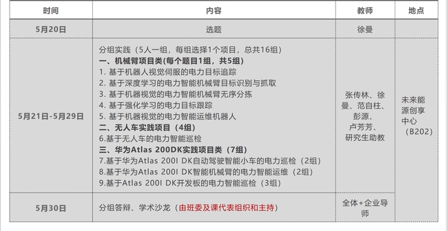 本次选题采用“软件+硬件+AI+能源电力”结合的模式。在前序课程《人工智能技术及电力系统应用》中,学生已经分组开展初步实践,实现了“AI+电力”的软件设计或相关算法,在此次课程中所有选题均增加“硬件”模块。根据硬件的类别,分为机械臂项目类、Appolo无人车类、华为开发板类三大类,其在能源电力场景的应用包括电力智能巡检系统、电力智能运维系统两大类,三类硬件九个实践题目,覆盖两大能源电力应用场景。