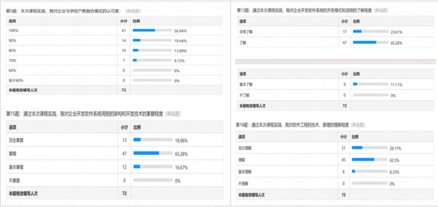 本次课程实践获得学生的一致认可和好评,学生们表示收获很大,在短暂的十天时间里,能够快速地了解和掌握企业开发软件项目的流程和技术,深入理解软件工程的技术原理,极大地调动了学习的热情和积极性,充分领悟了团队合作的重要性,在树立技术自信的同时也树立了就业自信。企业对本次学生课程实践的成果表示称赞,对学生在实践过程中表现出来的学习潜力也深表认可和欣赏。