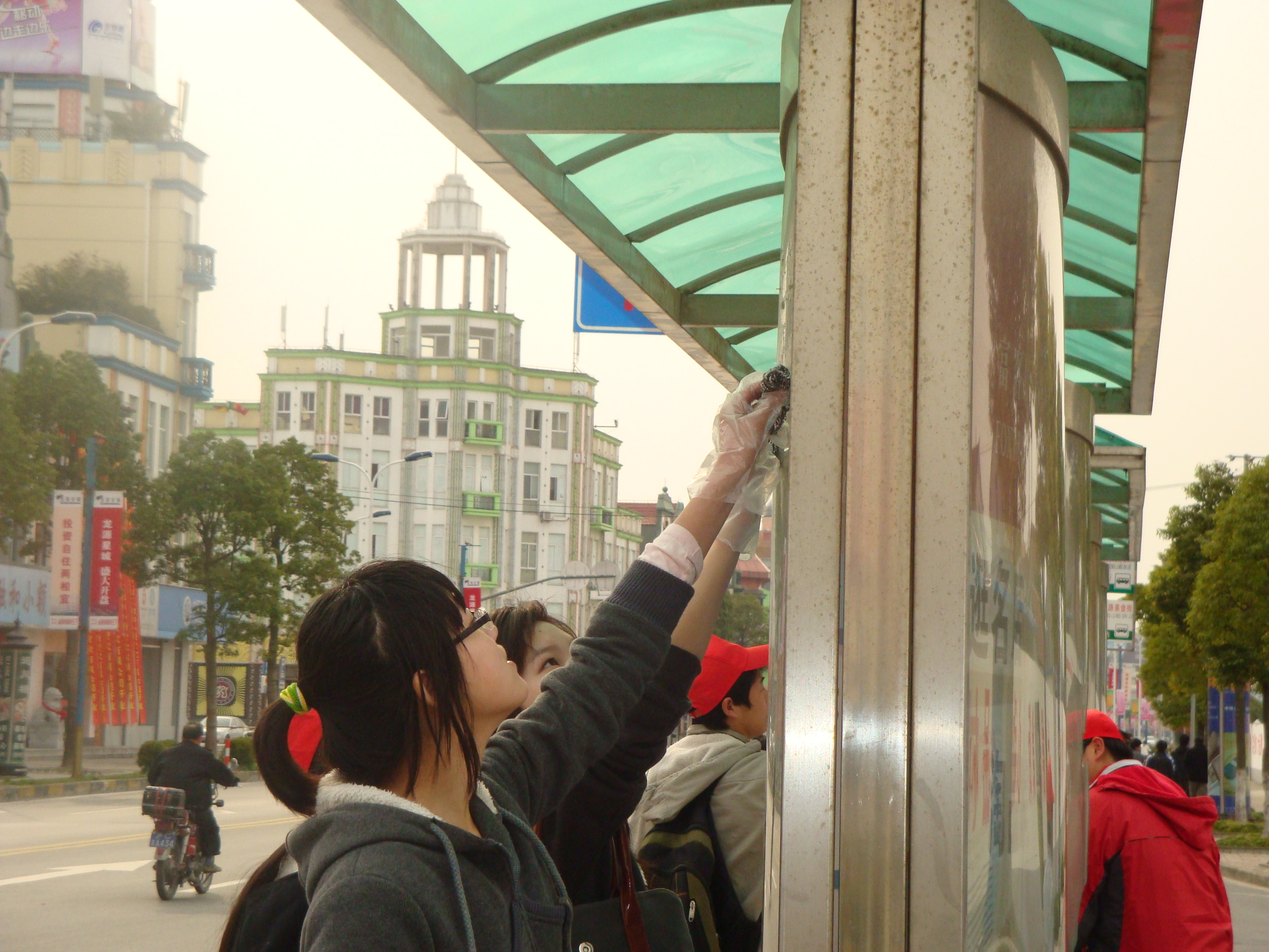 ,2008112团支部的同学们戴着小红帽,顶着烈日,拿起钢丝球擦拭学校周围和南汇大学城人民东路沿途3公里公共设施上的小广告。他们从身边的小事做起,为上海举办世博会贡献自己的力量。雷锋精神是我们中华民族宝贵的精神财富,它激励着一代又一代的青年健康成长,促进社会文明的进步,积极为上海世博会做贡献。