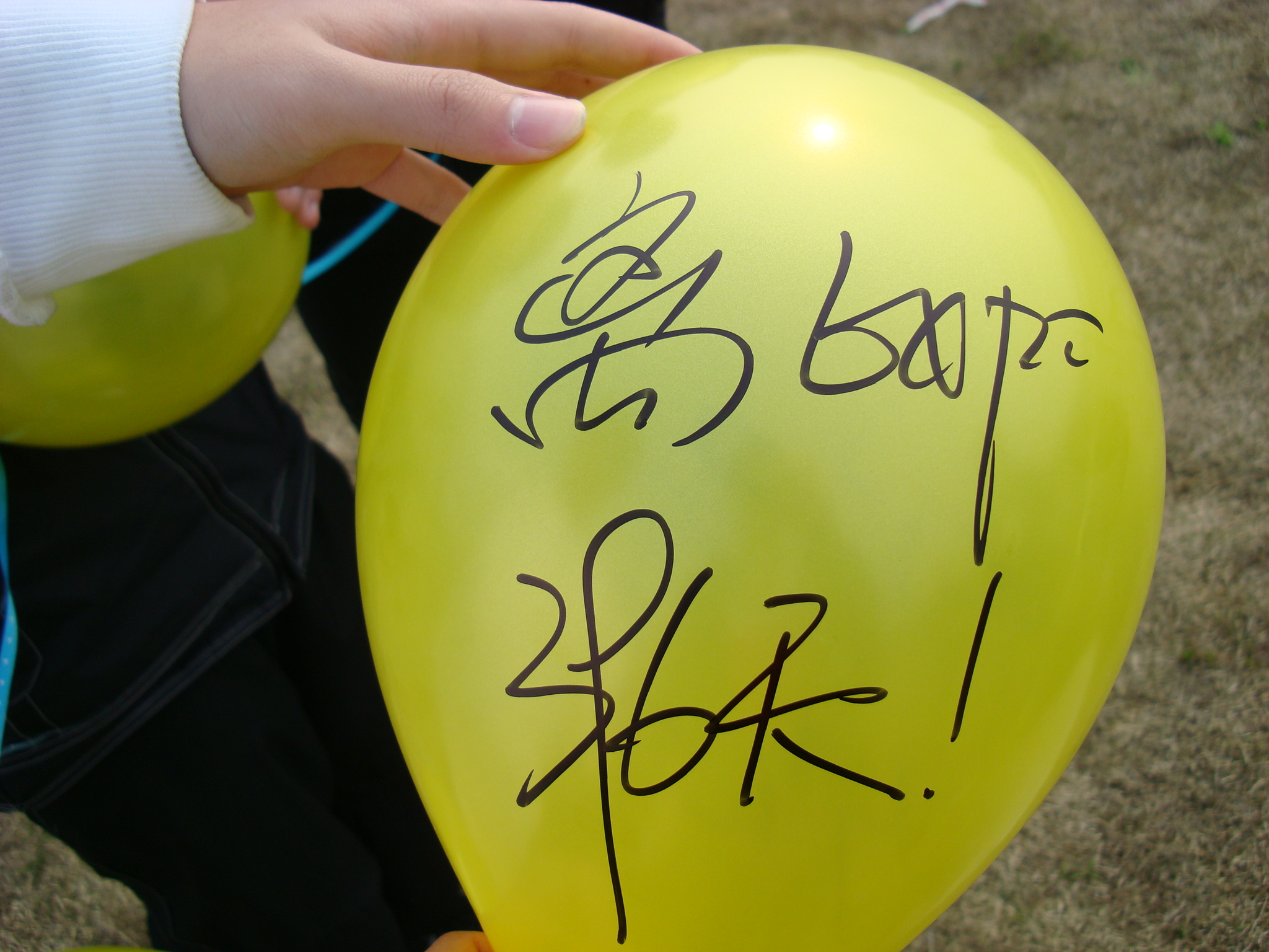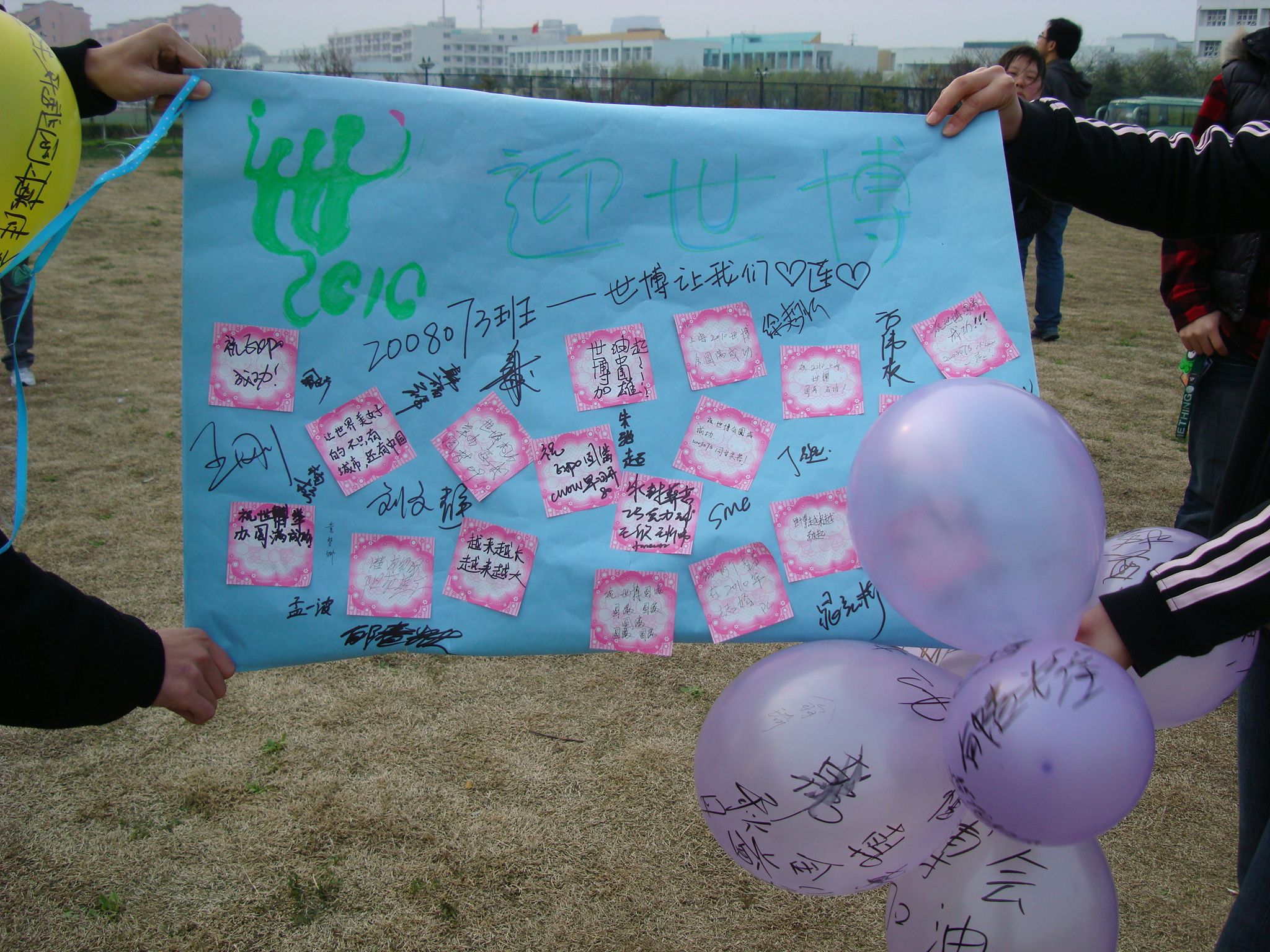 3月31日 beat365体育官网2008073团支部在南汇校区草坪开展了“世博,让我们心连心”主题团日活动之二“为世博加油”。其间,同学们围成一圈,畅谈对世博的展望与期待。大家将自己对世博的祝福写在气球上将其放飞,共同制作了一个“愿望谱”为世博加油打气。最后,同学们在"丢手绢":和"拷贝不走样"的游戏中结束此次活动。