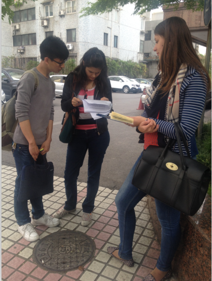 活动人员首先分为两组,分别在虹口鲁迅公园和上海外国语大学校区主干道对路人进行第一次问卷调研,接着在学生下课后,再次分为两组,分别对教学区与宿舍区的学生进行调研。在针对留学生的调研中,支部党员通过英语与外国留学生进行交流,得到了热情的回应与积极的配合。在填写问卷时,活动人员通过各种方式对不易理解的地方进行了翻译,学生们也主动一起探讨问卷的内容,如他们是如何看待大学生志愿者活动,用什么样的形式去推广这种志愿者活动等。在问卷完成时,活动人员尝试用法语,韩语,日语等不同国家的语言对相应国籍的留学生道谢,得到了对方积极的反馈,也让整个气氛更加轻松愉快。