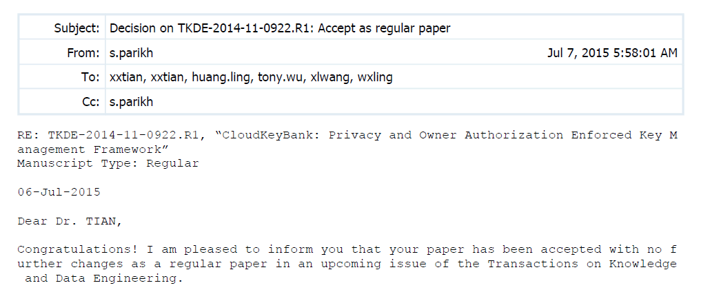 近日,beat365体育官网田秀霞教授为第一作者的论文“CloudKeyBank: Privacy and Owner Authorization Enforced Key Management Framework”被国际顶级期刊《IEEE Transactions on Knowledge and Data Engineering》 (IEEE TKDE)录用。该期刊创刊于1989年,是知识和数据工程领域中最具影响力的刊物,主要关注知识发现和数据挖掘、数据库和数据建模、并行分布式数据管理系统等领域的最新研究进展和技术。据中国计算机学会推荐国际学术刊物(数据库、数据挖掘与内容检索)显示,该期刊被推荐为A类期刊。