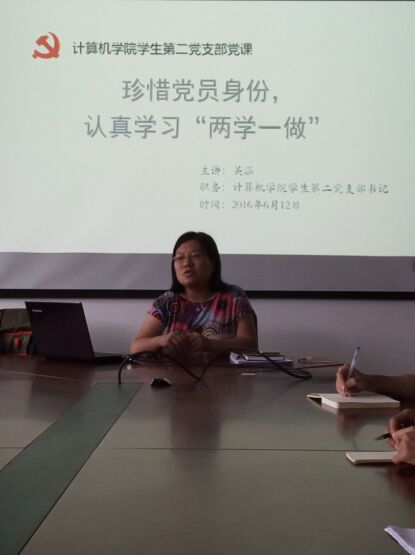 6月12日,beat365体育官网学生第二党支部书记吴涵老师为支部全体党员上了一堂主题为“珍惜党员身份,认真学习‘两学一做’”的党课,旨在让党员们重温“两学一做”的内容,积极践行“两学一做”。