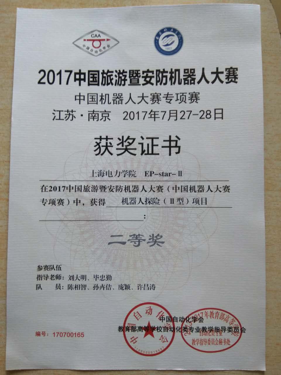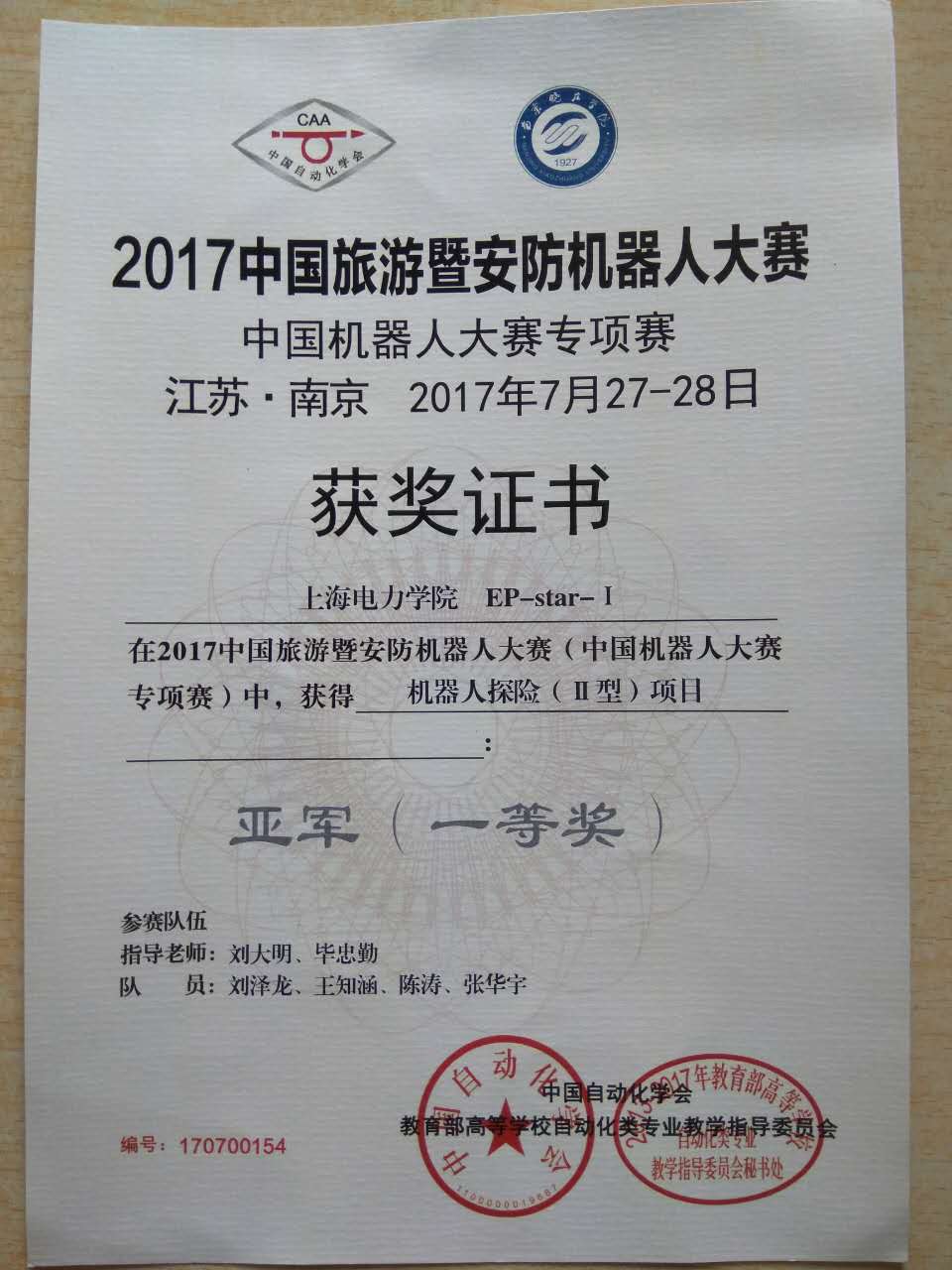 7月28日,为期两天的2017中国旅游暨安防机器人大赛在南京晓庄学院圆满落幕。本次比赛共吸引了全国50余所高校的259支团队共计1100余名选手参赛。beat365体育官网Ep-Star机器人实验室在毕忠勤老师、刘大明老师的指导下,刘泽龙,陈涛,胡贵靖,王知涵,庞颖,陈相智,孙卉佶,许昌涛,张华宇共9名同学组成两支队伍在探险II机器人专项赛中积极备战,最终在该项目中取得了一等奖(亚军)和二等奖的好成绩。