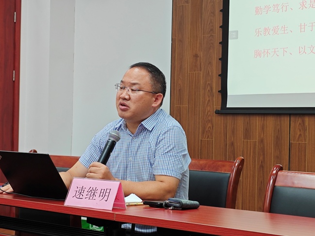 首先,速继明教授以“习近平教育强国论述与教育家精神的践行”为主题,从三个维度,用通俗易懂的语言和丰富的实际案例来阐释习近平教育强国重要论述、中国近代史以来教育的发展历程、新时代教育家精神的践行,深入浅出地阐述了如何做一名好老师,如何坚定信念成才报国。他强调,作为教师,不仅要学高为师,具备扎实的专业知识,更要身正为范,以高尚的品德和言行影响学生。并鼓励青年教师,努力成为身心健康、有家国情怀、有社会责任心、有职业能力和有文化底蕴的人。