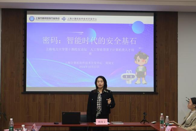 上海计算机软件中心项目经理、2014届校友周琦文,围绕“密码:智能时代的安全基石”主题分享密码对数据安全、网络安全以及人工智能系统安全的重要性,结合在上海软件中心的工作经历分享自己对人工智能背景下网络安全工作的重要性以及挑战等,特别分享自己围绕“商小密”的工作经历,鼓励同学们提升多种思考能力积极应对人工智能背景下带来的机遇和挑战。随后,向学院赠送《商小密之四大名著奇遇记》作为留念。
