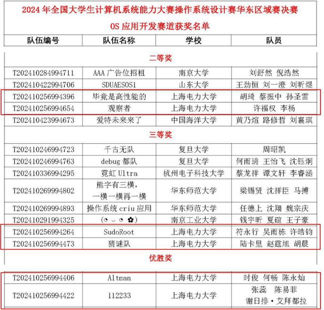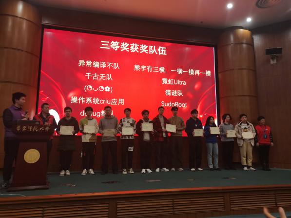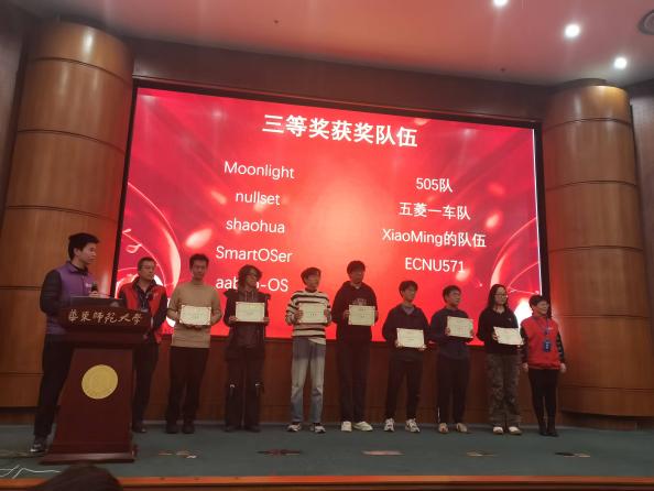 2025年1月12日,2024年全国大学生计算机系统能力大赛—操作系统设计赛(华东区域赛)在华东师范大学圆满落幕。我校beat365体育官网平台20支队伍进入决赛并取得优异成绩,荣获二等奖3项、三等奖6项、优胜奖10项,其中“观察者”队(许福权、李杨)、“毕竟是高性能的”队(胡琦、蔡振中、孙圣雷)获得OS应用开发赛道二等奖,“OS原理小队”队(付祉宁、杨裕凯)获得OS原理赛道二等奖;“异常编译不队”、“505队”、“blaze”、“深藏blue”队获得OS原理赛道三等奖;“猜迷队”、“SudoRoot”队获得OS应用开发赛道三等奖。