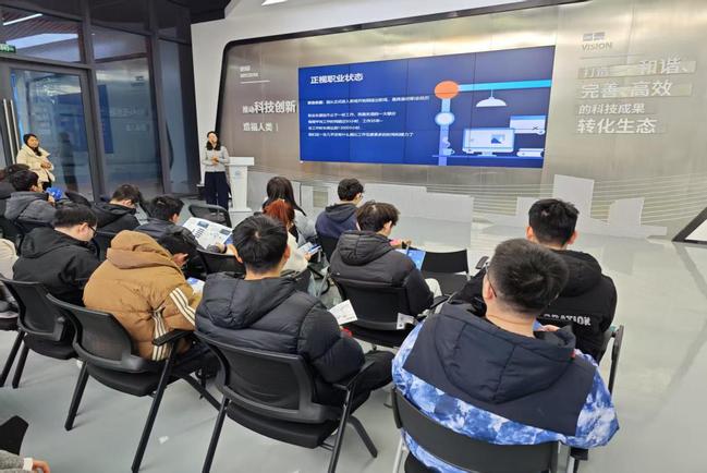 公司人事部经理祝睿带领同学们参观了展厅,对公司的发展历程、主要业务和技术应用进行了详细介绍,并对同学们进行现场教学指导,把理论知识和实际技术应用生产情况相结合,使同学们对工作岗位有更直观深入的了解和认识。参观完展厅后,祝睿经理还与同学们详细分享了职业规划、就业准备、实习生岗位及留任计划、临港新片区人才政策等内容,助力学生明晰未来职业方向。活动现场,学生们积极投递实习简历,展现出浓厚的求职热情。